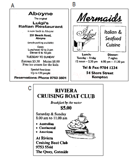 Look at the three restaurant advertisements on the following page. Answer the questions below by writing the letters of the appropriate restaurants (A—C) in boxes 1-7 on your answer sheet.