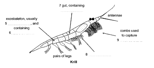 Krill live in every ocean of the world. They thus come in many varieties, although all sporting a similar shrimp-like appearance, with an exoskeleton divided into three parts, and with two large antennae at the front, and pairs of legs running down the underside. These creatures are distinguishable from shrimp by their gills, which are externally mounted, and resemble rows of fibrous combs alongside their bodies. Another oddity is that their exoskeleton is usually transparent. This, and their small size, lead to the deceptive conclusion that they are an insubstantial presence, of little importance, until one is informed that an adult blue whale can consume almost 40 million krill, with a total weight of 3,600 kilograms, in just one day.
