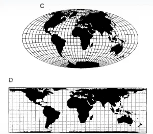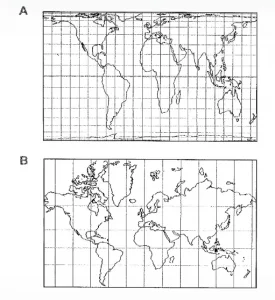 The simplest two-dimensional representation is a ‘cylindrical’ projection – what you get by wrapping a sheet of paper around a globe and simply transferring the information across. This means it indicates true north and south. So, Newfoundland is directly north of Venezuela and it appears that way on the map. East and west similarly are also indicated correctly. Such a map demonstrates what is called ‘fidelity of axis’.