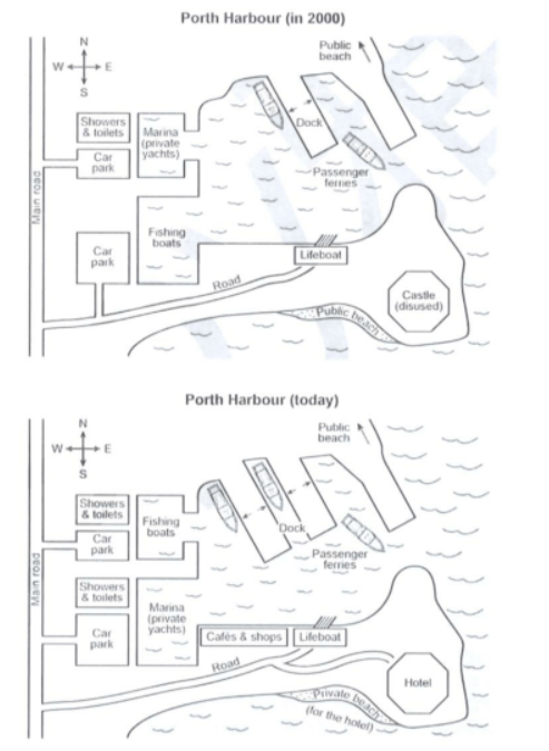 Task 1: The plans below show a harbour in 2000 and how it looks today. Summarise the information by selecting and reporting the main features, and make comparisons where relevant.