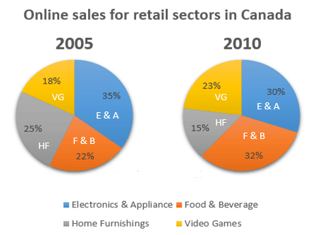 Task 1: The two pie charts below show the online shopping sales for retail sectors in Canada in 2005 and 2010.