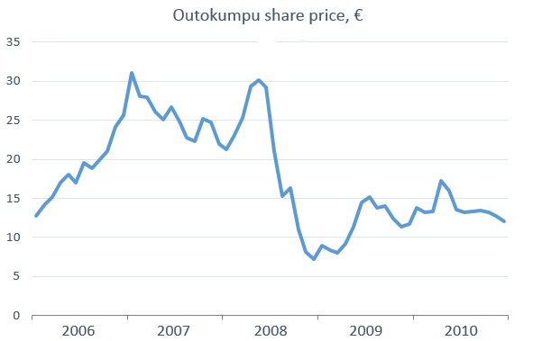 Task 1: The line graph below shows the changes in the share price of Outokumpu companies in euros between January 2006 and December 2010.