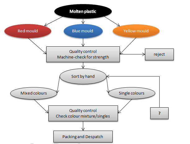Task 1: The flowchart illustrates the production of coloured plastic paper clips in a small factory.