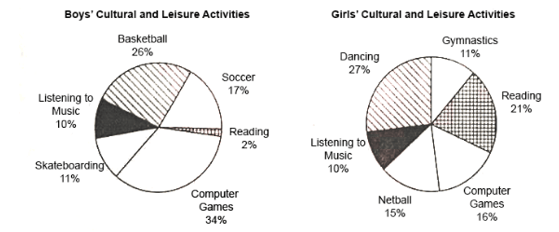 Task 1: The pie graphs below show the result of a survey of children’s activities. The first graph shows the cultural and leisure activities that boys participate in, whereas the second graph shows the activities in which the girls participate.
