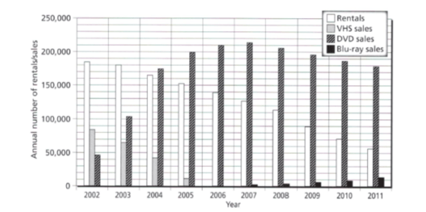Task 1: The chart below shows the annual number of rentals and sales (in various formats) of films from a particular store between 2002 and 2011.